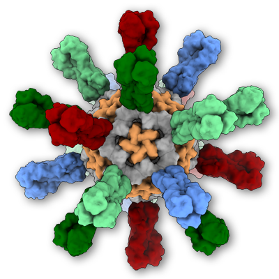 Natural proteins often self-assemble into highly ordered nanoscale objects. The sophisticated functions of these molecular machines suggests that the ability to design novel self-assembling protein nanomaterials with customized structures and functions would have immense practical value. The King Lab computationally designs new protein nanomaterials with atomic-level accuracy, with a focus on structures suited for applications in medicine, particularly vaccines and biologics delivery. We are currently working on methods to i) increase the complexity of the architectures accessible to design, ii) genetically encode the ability to sense and respond to environmental changes, iii) incorporate functional elements into our designed materials, and iv) design materials tailored to display or interact with native proteins of interest. See here for our publications in this area.